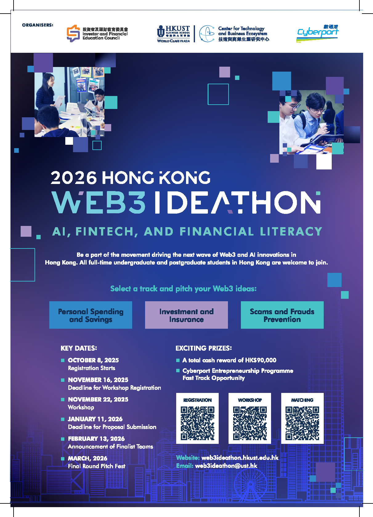 Building on the success of the 2025 Hong Kong Web3 Ideathon, the 2026 Hong Kong Web3 Ideathon: AI, FinTech, and Financial Literacy provides a unique opportunity for tertiary students across Hong Kong to display their innovative ideas, technical knowledge, and business visions while exploring the transformative potential of Web3 and AI. Students can team up with fellow innovators and pitch impactful projects to enrich our digital landscape in Hong Kong.