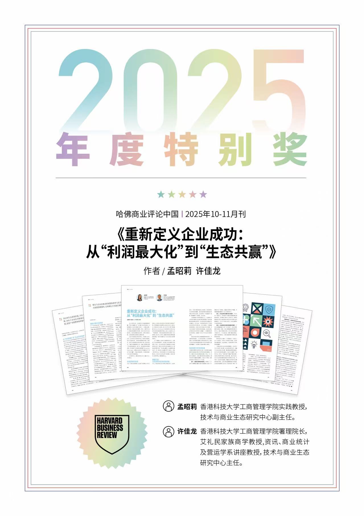 An article titled "Redefining Corporate Success: From 'Profit Maximization' to 'Co-beneficial Ecology'" co-authored by Professor Zhaoli MENG, Associate Director of the Center for Technology and Business Ecosystem, and Professor Kai-Lung HUI, Acting Dean of HKUST Business School and Director of the Center for Technology and Business Ecosystem, was published in the October/November issue of Harvard Business Review China and credited with the 2025 Annual Special Award by the magazine.